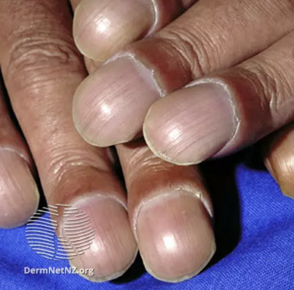 Skin surrounding the nails may be red and tender with swelling that reduced the Lovibond angle between the nail bed and nail fold